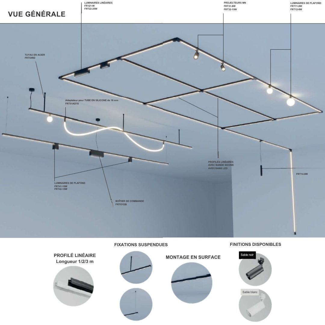 Plein de variantes d'installation (mur ou plafond et mur/plafond, suspendu par câble ou par tige).
